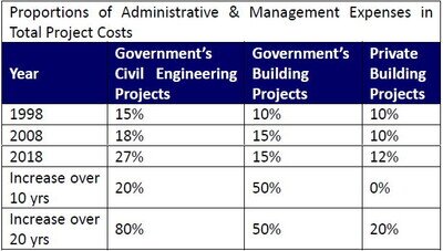Time is money. Lengthening a project will increase various administrative and management expenses accordingly, including those related to machinery, insurance, and basic running cost. Take my own company as an example, the difference between the administrative and management expenses involved in our latest tenders and those submitted 10 and 20 years ago is shown in the following table: